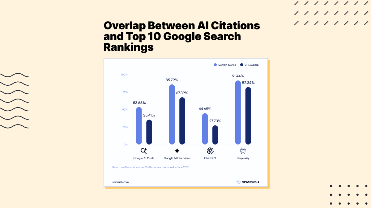 - Perplexity had both the highest overlap of domains and URLs cited (sharing over 90% overlap with the top Google search rankings).