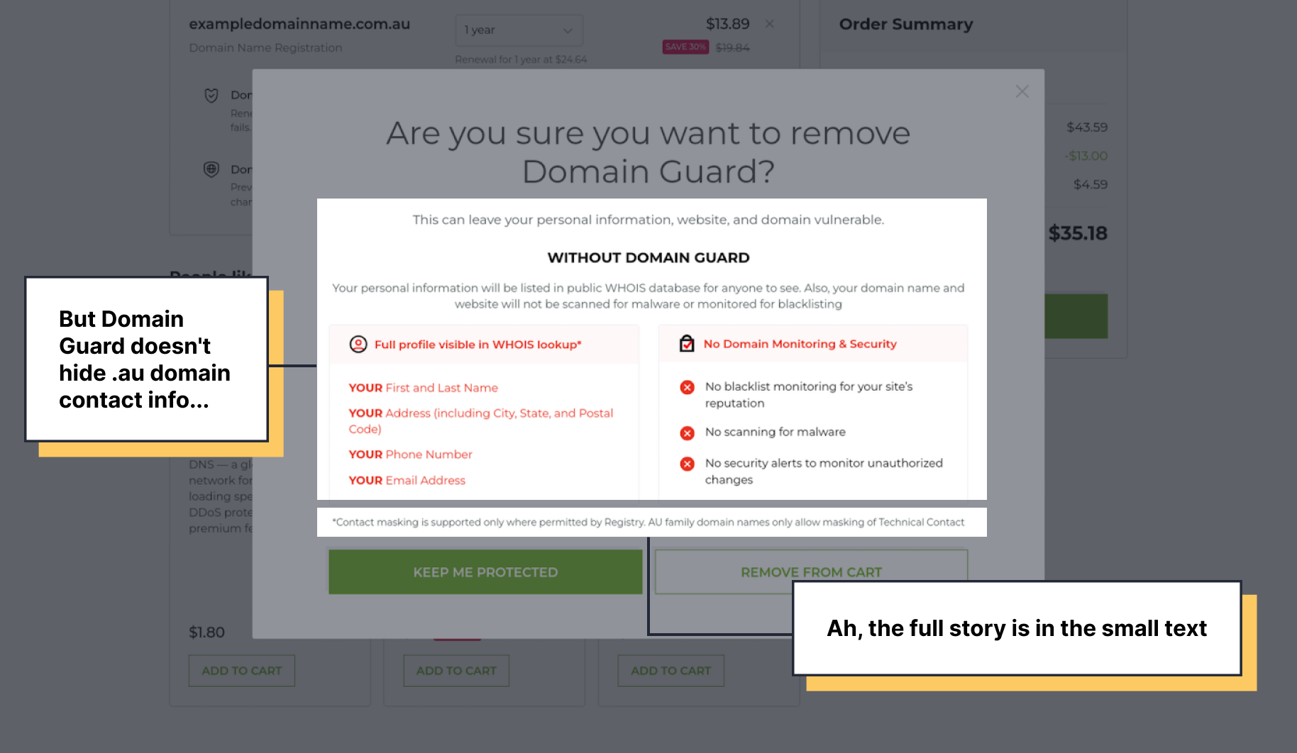 But when it comes to Australia’s .au domains, ID Protection isn’t available—the .au Domain Administration forbids it. Crazy Domains still sells Domain Guard at the same price for .au domain holders as it does for any other type of domain. You’re paying ~$10 a year for a bundle that usually comes with ID Protection, which is worth $10 a year, except you’re not getting the valuable part of that package. You’re just getting the other three features in the bundle, which are the lesser add-ons.